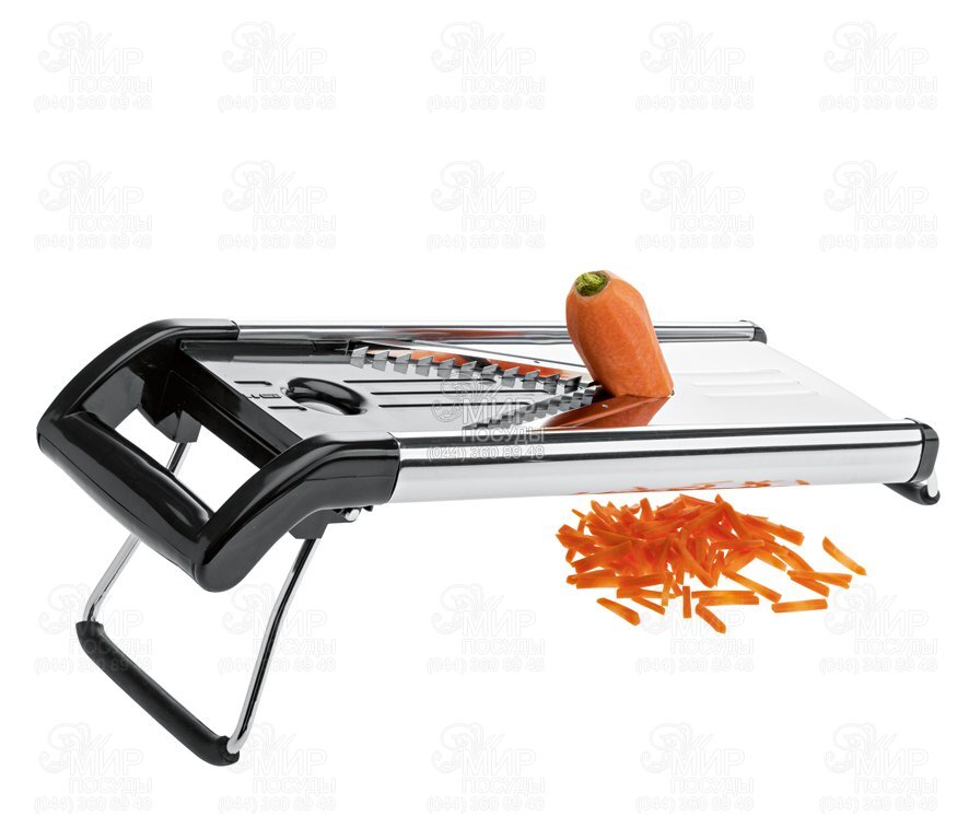Професійна терка Kuchenprofi KUCH0900431000 з насадками виготовлена з високоякісної нержавіючої сталі. Має зручну ручку тримач і відкидну металеву підставку для комфортного натирання продуктів. Гострозаточені леза насадок, які входять до комплекту, дозволять швидко і легко подрібнити будь-які овочі чи фрукти. А щоб уберегти руки від порізів у набір включений спеціальний тримач.