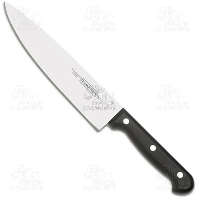 Ніж кухарський ULTRACORTE 23861/107 від бренду TRAMONTINA виготовлений із нержавіючої сталі ISI 420 з двостороннім заточенням. Має ергономічну рукоятку з міцного пластику в чорному кольорі.