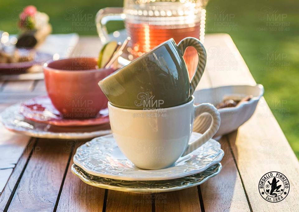 Набір чашок із блюдцями Артишок та птиця від португальського виробника Bordallo виготовлений із кераміки в техніці майоліка. Посуд пофарбований вручну у приємний білий колір. Страви прикрашають пишні рослинні візерунки, а ручки глянсово блискучих чашок доповнені спіральними візерунками. Комплект дуже доречний підійде для душевного чаювання з дорогими гостями.