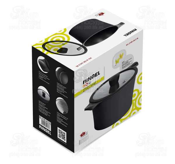 Каструля Zitrone від Ringel виготовлена з потовщеного литого алюмінію та відрізняється супер міцним покриттям Mega-Stone - стійким до утворення зовнішніх пошкоджень та подряпин. До переваг також можна віднести функціональну кришку, яка оснащена отвором для випуску пари і силіконовим обідком, який перешкоджає появі сколів. У комплекті з каструлею йдуть дві силіконові прихватки у формі метелика з магнітним утримувачем.