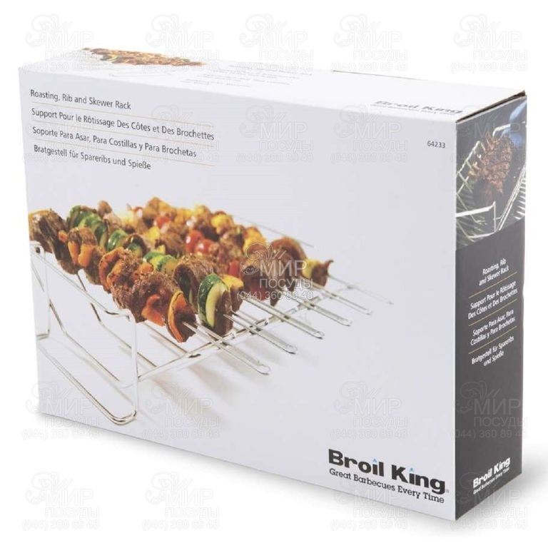 V-подібні грати з 6 шампурами від американського виробника Broil King виготовлені з високоякісної нержавіючої сталі. Комплект багатофункціональний і підходить для приготування на грилі птиці, шашликів та соковитих ребер. Шампура досить гострі, добре проколюють м'ясо. На таких ґратах шашлики виходять просто чудовими. Ґрати прослужать довго, при цьому не втратить свій початковий чудовий зовнішній вигляд, тому що не іржавіє. Доглядати її не складно і багато місця вона не займає.
