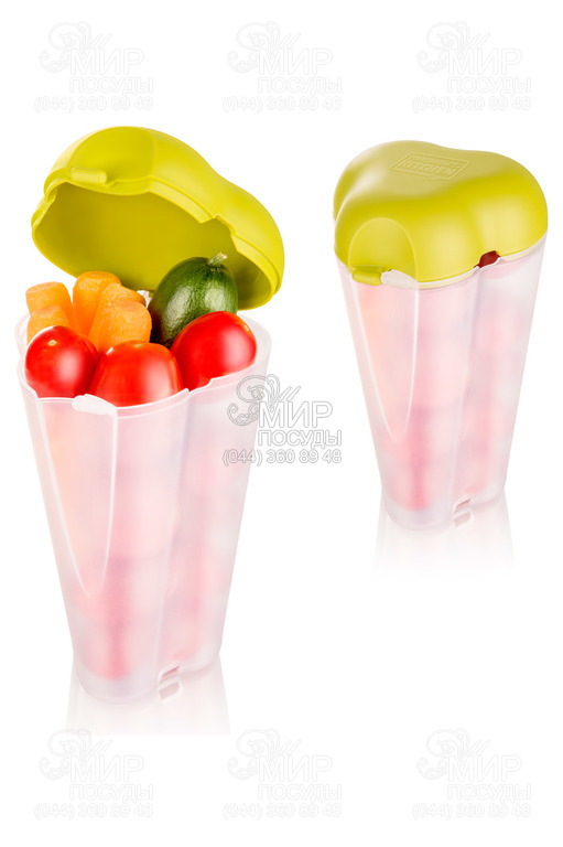 Міцний прозорий футляр від компанії Tomorrow's Kitchen захищає шматочки фруктів та овочів від виминання та завітрювання. Отвори в основі та кришці контейнера служать для вентиляції і дозволяє вмісту "дихати". Розумний дизайн дозволяє зручно переносити контейнер у шкільному рюкзаку, дамській або спортивній сумці, розміщуватись у автомобільному тримачі склянки. Ідеальний спосіб взяти із собою свіжі вітаміни. Розумний аксесуар для здорового способу життя.