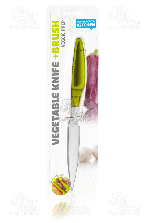 Ніж для овочів та щітка від компанії Tomorrow's Kitchen справляються з чищенням та нарізкою овочів. Лезо ножа виготовлене з нержавіючої сталі з легкістю знімає найтонший шар шкірки, а щітка дозволяє очистити найважчі ділянки. Практичний дизайн "2-в-1" дозволяє компактно зберігати пристрої.
