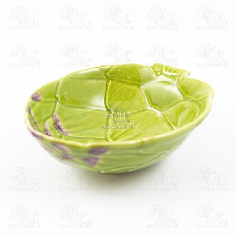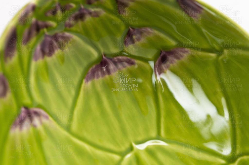 Тарілка для супу Артишок від португальського виробника Bordallo виготовлена з кераміки у стилі майоліка. Не вимагає спеціального догляду, яскраві фарби не потьмяніють від регулярного миття в посудомийній машині. За потреби остигли страви можна розігріти в мікрохвильовій печі. Зроблена у вигляді суцвіття артишоку і має досить натуралістичний вигляд. Вона витримана у світло-зеленому кольорі з яскраво виділеними лусочками, кінчики яких забарвлені у біло-фіолетовий колір, що надає виробу природності. Тарілка використовується як порційна сервірувальна.