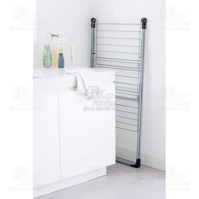 Підлогова сушарка для білизни від відомого голландського бренду Brabantia, відомого своїми інноваційними рішеннями та зручністю продукції, стане незамінним помічником у будинку та не займе багато місця. У розкладеному стані сушарка займає лише один квадратний метр площі. Вона складається з трьох ярусів, на яких зручно розмістити довгі штани, так і одяг невеликого розміру. На нижньому ярусі можна розкласти одяг, що вимагає делікатного сушіння на рівній поверхні. Сушарка має нековзна накладки на ніжках, які захищають поверхню підлоги від подряпин, легко складається, при необхідності її дуже просто перенести в інше місце навіть з розвішеними речами.