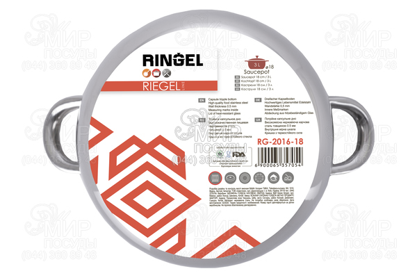 Каструля Riegel від Ringel виготовлена з нержавіючої сталі. Має ручки з неражаючої сталі з надійним кріпленням, для безпеки використання. Відрізняється дзеркальним зовнішнім та внутрішнім покриттям та мірною шкалою, завдяки чому можна з легкістю точно відміряти об'єм рідини для приготування. До переваг також можна віднести функціональну кришку, яка оснащена отвором для випуску пари і металевим обідком, який забезпечує довговічність продукції.