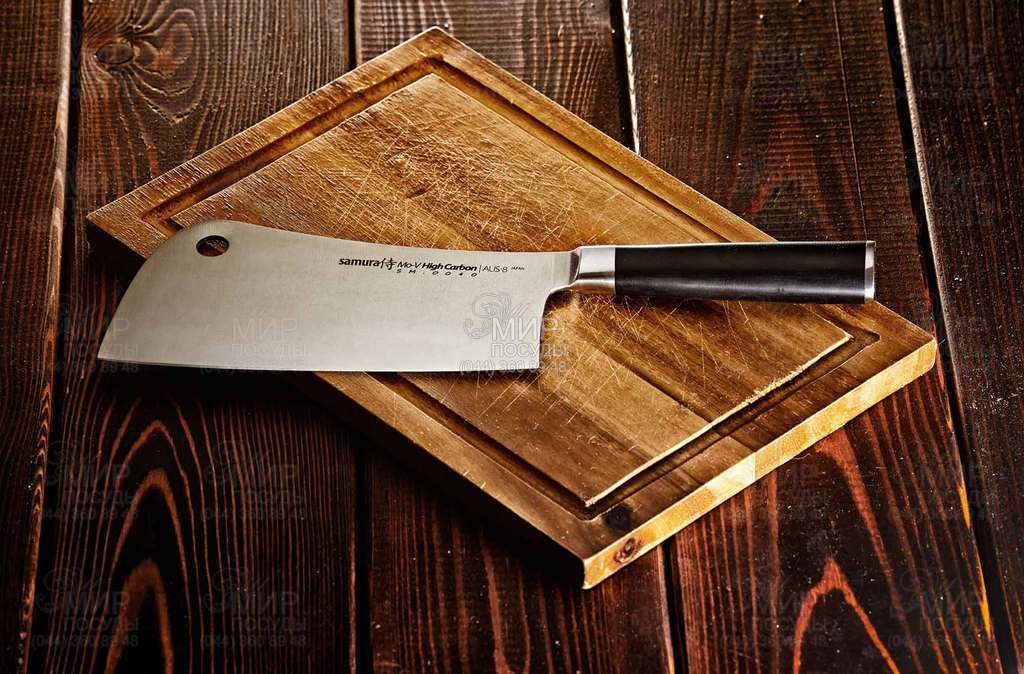 Сокира для м'яса - це потужний інструмент з широким і досить важким лезом. Кут заточування становить 40 °, заточення тримається дуже довго, при цьому лезо дуже гостре. Незамінний для різання та рубання великих шматків м'яса, приготування рубаного м'ясного фаршу, рубки суглобів та сухожиль. Не призначений для розрубування кісток! Японська нержавіюча сталь AUS-8, з якої виготовлений ніж, має гарну корозійну стійкість, відмінну стійкість ріжучої кромки, легко полірується і шліфується. Рукоятка ножа, виконана з волого- та термостійкого матеріалу G-10, зручно лежить у руці, не ковзає і стійка до агресивних середовищ. Samura "Mo-V" - це не дорогі та практичні ножі сучасного дизайну, які стануть справжньою окрасою на будь-якій кухні.