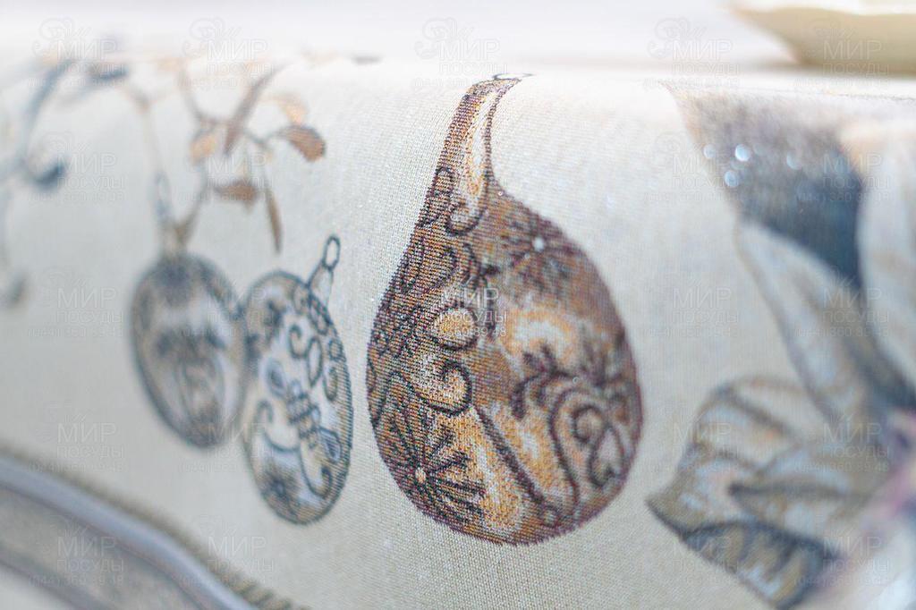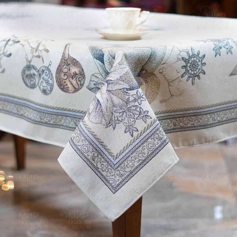 Скатертина Срібна пуансеттія від Villa Grazia Premium виготовлена з гобелену з тефлоновим просоченням. Як основа новорічного сервірування текстиль, який легко відмивається в автоматичному режимі, стане приємною підмогою господиням. Красива картина не втрачає насиченості відтінків, а сам виріб зберігає ідеальну форму, не даючи усадки ні на сантиметр. Міцне полотно прикрашають малюнки, виткані жакардовим плетенням із волокон сотень відтінків. За рахунок тефлонового просочення скатертина майже не вбирає воду, не меніться і не линяє.