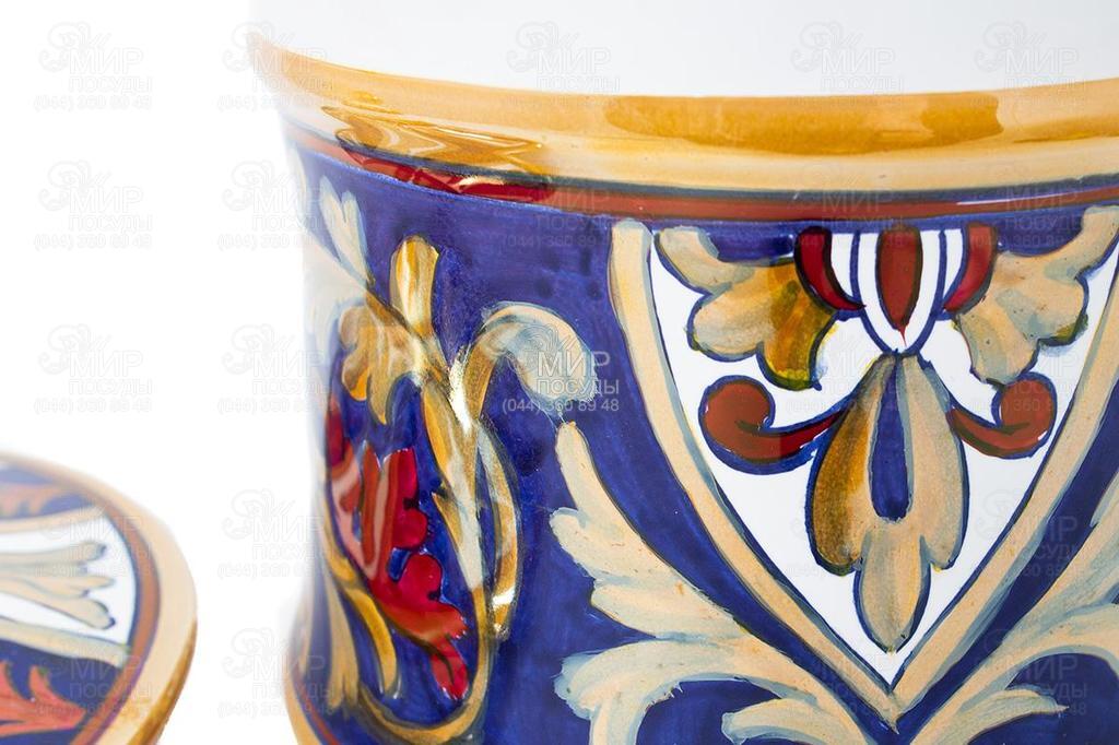 Прекрасний витвір італійських майстрів представлений у дивовижній колекції Lustro Antico. Мистецтво Ренесансу – концепт, який дизайнери бренду L?Antica Deruta майстерно втілили у вишуканому стилі цієї розкішної серії кераміки. Округлі боки невисокої об'ємної вазочки прикрашені ручним розписом, кожен штрих якого є неповторним. Пензель художника майстерно вивела елементи рослинного орнаменту, які додали в прохолоду глибокої синяви теплі золотисті акценти шафрану та соковиту яскравість червоного відтінку. Товсті міцні стінки та зручна кришечка виготовлені з італійської кераміки – щільної, важкої та міцної. Покриття глянсовою глазур'ю надає виробу чудового блиску. Повністю ручна робота. Кожен виріб із підписом фабрики. Відтінок кожного виробу може відрізнятися через ручну роботу. Рекомендований догляд: протирання сухою або трохи вологою тканиною. Заборонено миття в посудомийних машинах та з використанням абразивних засобів.
