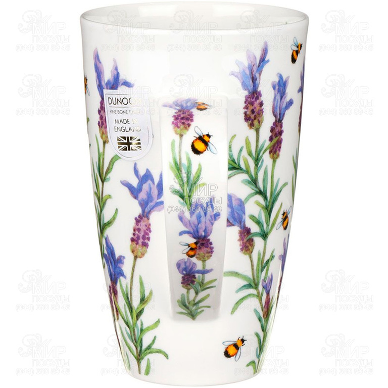 Кухоль Henley від англійського виробника Dunoon виготовлений з кісткового фарфору. Це тонкий, легкий і міцний матеріал, теплий і гладкий на дотик, напівпрозорий на світі, що має особливий глянсово-шовковистий блиск. Місткість має досить зручну форму з ергономічною ручкою. Декорована кумедним малюнком у вигляді яскравої лаванди.