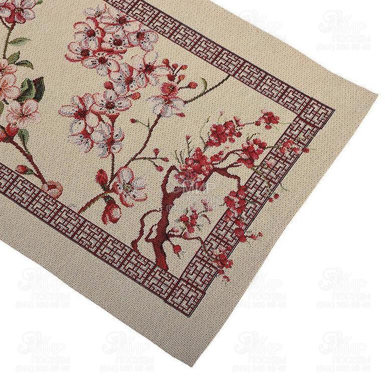 Романтичний та ніжний акцент в інтер'єрі створить гобеленова серветка з візерунком із гілок сакури. Рожеві пелюстки, зелене листя та коричневі стебла виразно виділяються на пісочному тлі, завдяки чіткому фактурному плетиву. Багатобарвна картина виткана з тисяч міцних тонких волокон різного кольору, що дозволило передати всі тонкощі художнього ескізу. Щільний гобеленовий жаккард чудово переносить автоматичне прання, його можна обробляти засобом для виведення плям для кольорових тканин. Навіть через багато років раннер ідеально збереже форму, колір та щільність.