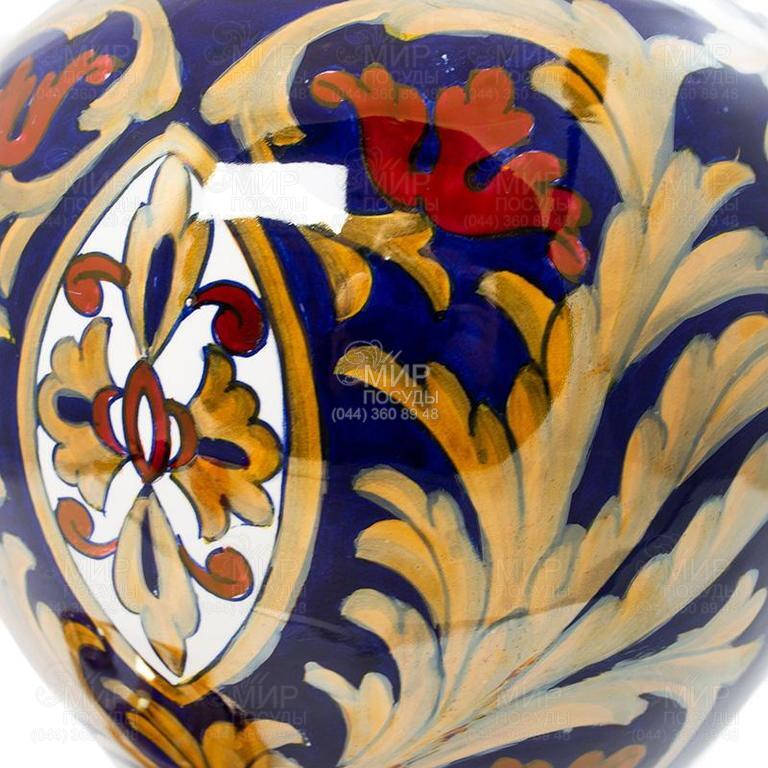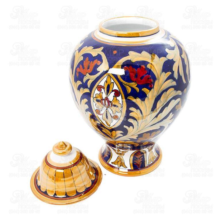 Вишуканий виріб ручної роботи італійських майстрів представляє у нашому салоні знаменитий бренд L?Antica Deruta. Велика ваза із міцної важкої кераміки має класичну форму та оригінальне доповнення у вигляді фігурної кришки. Приголомшливий художній розпис відтворює орнамент, характерний мистецтва Ренесансу. Рослинні мотиви золотаво-жовтого та червоного відтінку надають яскравої урочистості благородному синьому тлі. Малюнок наноситься тонким пензлем з використанням натуральних фарб, що точно передають палітру старовинного стилю. Античний блиск – це назва колекції та один із характерних штрихів дизайну. Яскраве вологе сяйво прозорої глазурі підкреслює велич та розкіш цього твору.