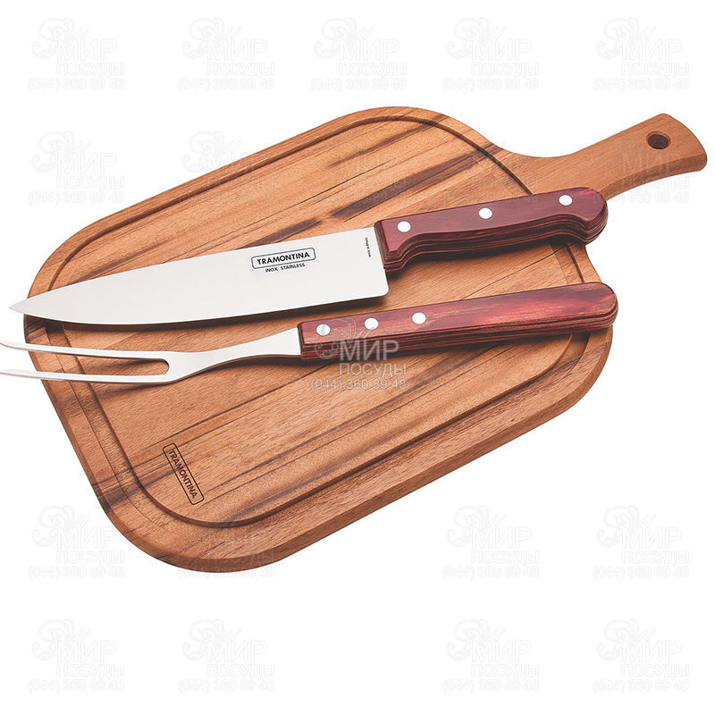 Набір для барбекю серії Polywood від бразильської компанії з виробництва посуду Tramontina надійний та практичний. Леза ножа та робочі частини вилки виготовлені з мартенситної нержавіючої сталі AISI 420, для якої характерна висока зносостійкість. Завдяки термообробці міцність сталі збільшується. Відполірована до дзеркального блиску сталь не темніє і не мутніє з часом. Ручки та обробна дошка виконані з натурального дерева, ретельно шліфованого та додатково обробленого, що робить їх водостійкими. Алюмінієві заклепки надійно закріплюють ручки.