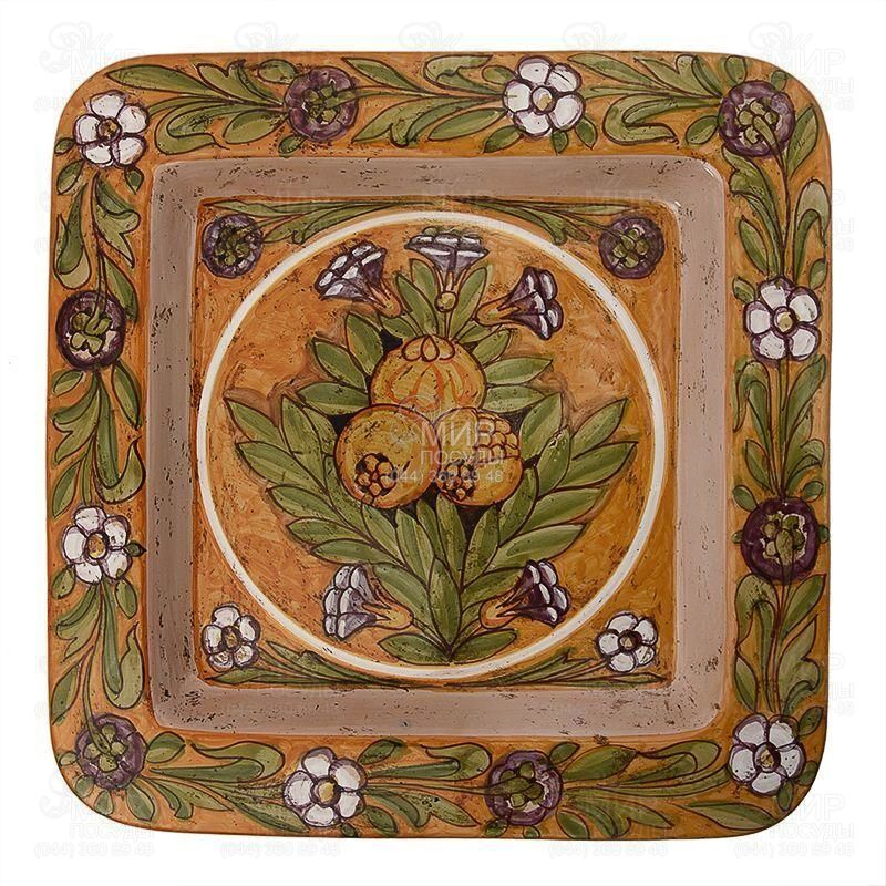 Квадратна керамічна страва ідеально підходить для декорування стін та прикраси камінних полиць. У колекції Scalfito італійський бренд L?Antica Deruta представляє безліч моделей кераміки з колоритним різьбленим візерунком. Тарілка виготовлена із щільної глазурованої кераміки. Лицьова сторона з малюнком гранатів та квітковим візерунком. Виріб виробляється та розписується вручну, тому в одному модельному ряді можливі невеликі відмінності у відтінках. На зворотний бік тарілки пензлем нанесено фірмовий підпис бренду. Догляд за цією продукцією простий, але делікатний: протирання від пилу або ручне миття у теплій воді без агресивної побутової хімії та абразивів.