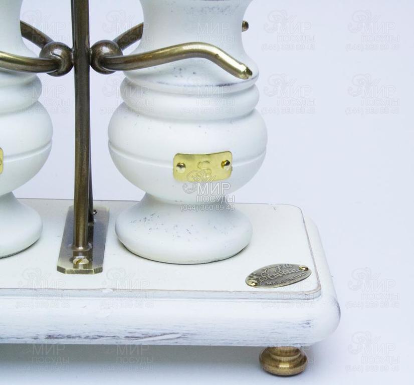 Ємності для солі та перцю на підставці виконані з антикварного дерева та декоровані зістареною латунню. Сільничка відзначена буквою "S" - sale/сіль, а перечниця буквою "P" - pepe/перець. Резервуари для спецій виготовлені із харчового пластику. Для того щоб наповнити їх сіллю або перцем, потрібно зняти латунний розсіювач у його верхній частині. Кожен предмет із колекції «Capanni» відзначений тавром виробника – медальйоном із зістареної латуні «F.lli Capanni Made in Italy».