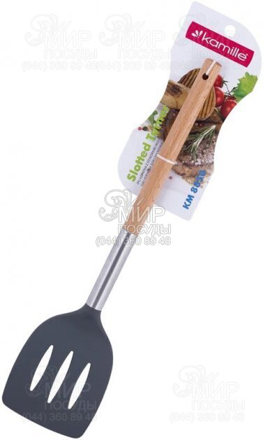 Лопатка Kamille із комбінованих матеріалів. Робоча частина виконана із чорного нейлону. Матеріал, безпечний для антипригарного покриття, не пошкоджує і залишає подряпин на покритті кухонного посуду. Ручка виконана з нержавіючої сталі та натурального дерева.