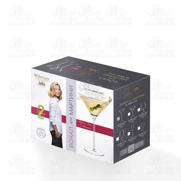 Набір бокалів для мартіні Wilmax виготовлений з кришталевого скла. Асортимент продукції Wilmax задовольнить всілякі переваги вимогливого ресторатора, а також буде цікавим для споживачів для використання в домашніх умовах. Він включає все необхідне для сервірування Вашого столу, має велику різноманітність форм, що дає можливість підібрати столовий посуд на будь-який смак і для будь-якого інтер'єру. Нова колекція келихів Wilmax, створена спільно з відомою актрисою та телеведучою, автором кулінарних книг – Юлією Висоцькою.